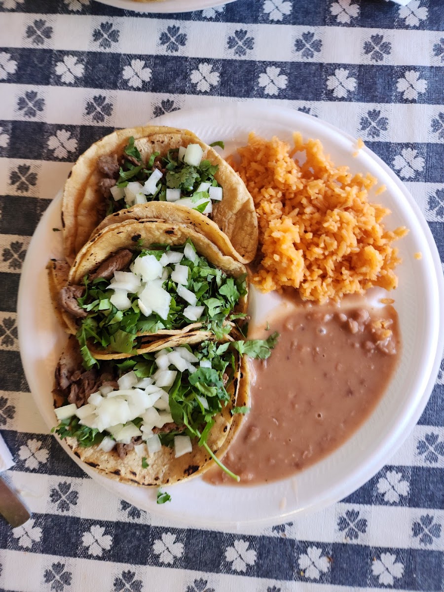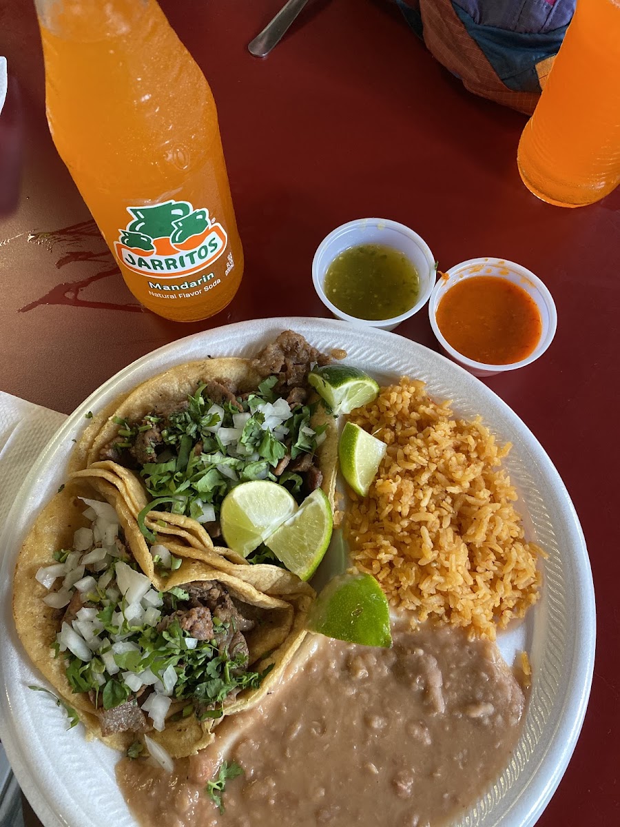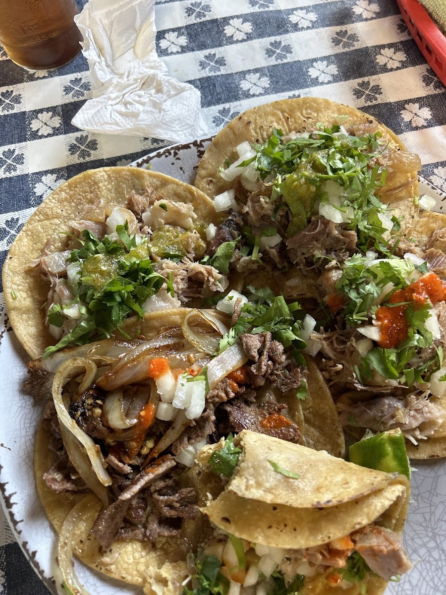 Amazing authentic steak tacos!!!!! They also have spicy pork too! The salsa verde was excellent. They also have real coke!